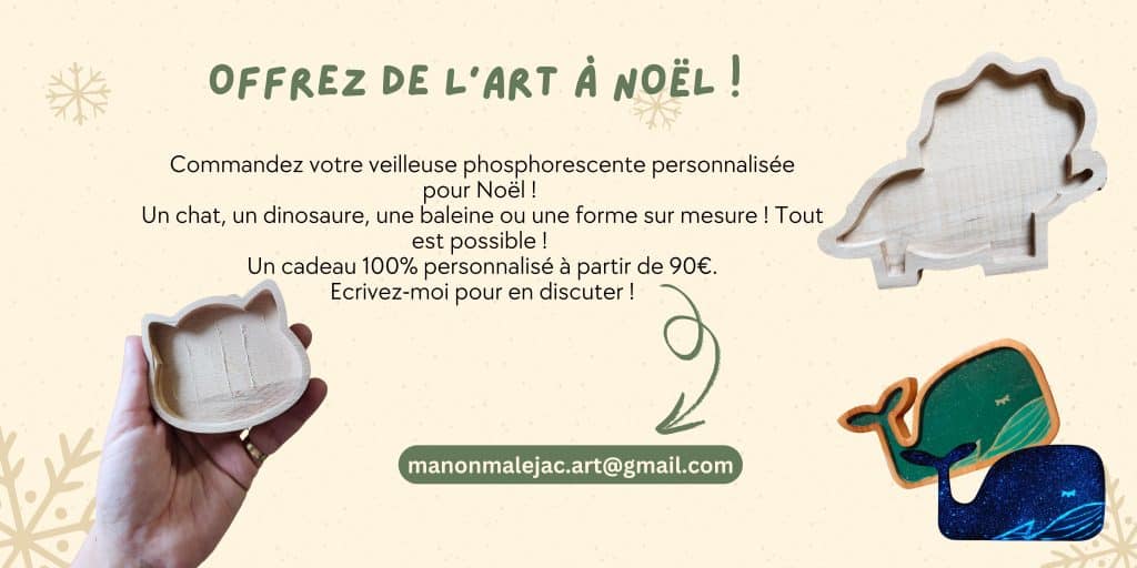 Artiste peintre autodidacte, je crée des œuvres phosphorescentes qui s’illuminent dans l’obscurité, des illustrations colorées et des objets d’art faits main. Mon univers mêle poésie, lumière et artisanat, pour des créations uniques à poser, encadrer ou offrir.