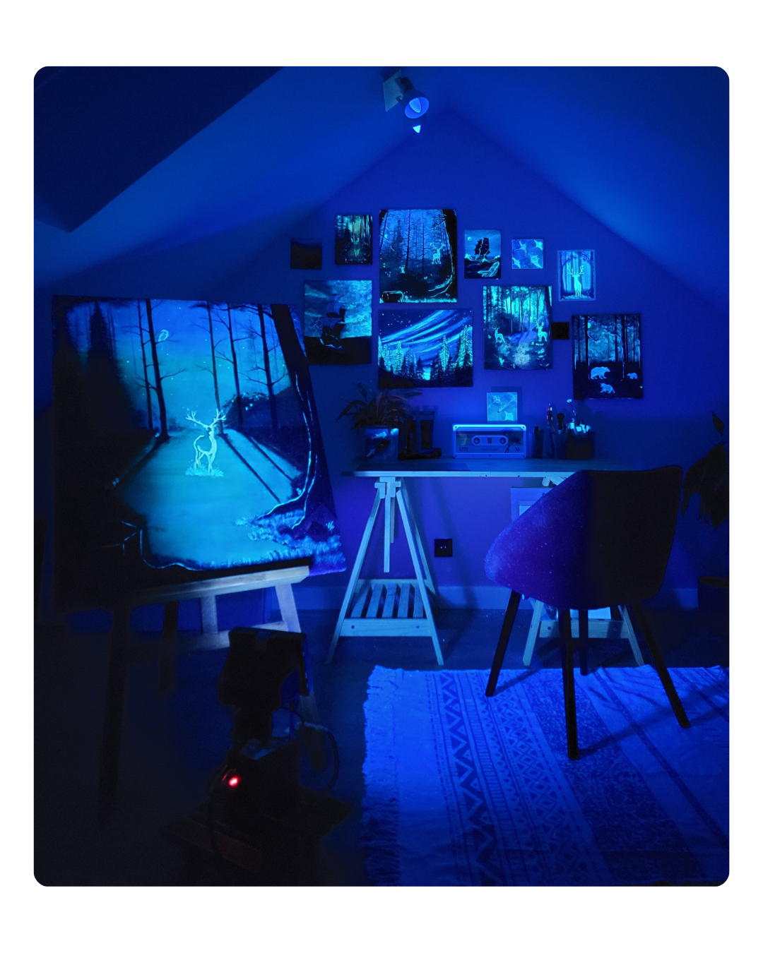 J’explore particulièrement les jeux de lumière et la dualité jour/nuit à travers la peinture phosphorescente, mais aussi l’illustration à l’aquarelle et la création sur mesure.