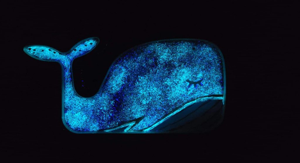 10 x 19 x1,8 cm – Peinture acrylique et peinture phosphorescente sur bois de hêtre découpé, finition résine époxy