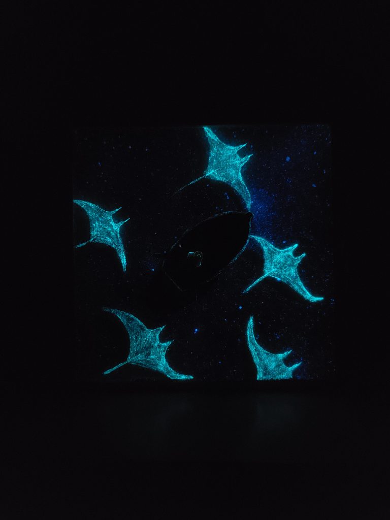 L’œuvre devant vous s’illumine dans la nuit, n’hésitez pas à allumer et éteindre la lumière LED pour apercevoir quelques détails.