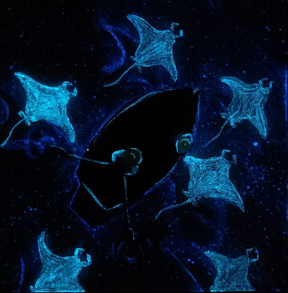 L’œuvre devant vous s’illumine dans la nuit, n’hésitez pas à allumer et éteindre la lumière LED pour apercevoir quelques détails.