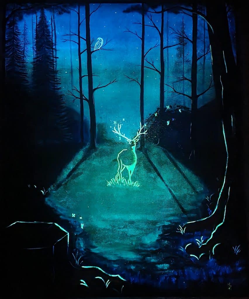 81 x 100 cm – Technique mixte : peinture acrylique, peinture phosphorescente, peinture à l’huile – Œuvre encadrée, caisse américaine bois